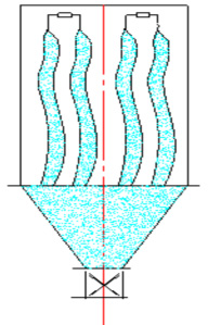 含塵氣體由進氣口進入灰斗或儲灰箱,通過花板孔或直接通過花板孔三種方式進入濾袋。如圖2a、b、c所示,含塵氣體透過濾袋變?yōu)閮魵?,進入箱體,再經(jīng)箱體上部排氣口,由風(fēng)機排走。粉塵積附在濾袋的內(nèi)表面,且不斷增加,使袋收塵器的阻力不斷上升。當(dāng)阻力上升到1500—2000Pa時為了使袋收塵器繼續(xù)工作,需定期清除濾袋上的粉塵。具體清灰時,首先關(guān)閉頂上風(fēng)機,搖動電機上偏心作用,帶動連桿,使搖動軸左右來回轉(zhuǎn)動,濾袋就呈波紋狀態(tài),使粉塵掉下,卸出。清灰狀態(tài)如圖3所示。