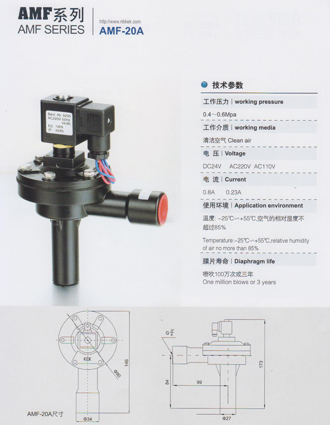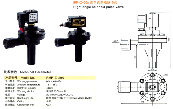 一、RMF-Z-20A-EX脈沖閥 電磁脈沖閥是脈沖袋式除塵設(shè)備中在低壓氣源壓力條件下使用的雙膜片快速脈沖閥。受脈沖噴吹控制儀輸出信號的控制,對濾袋逐排噴吹清灰,使除塵器的阻力保持在設(shè)定的范圍內(nèi),以保證除塵器的處理能力和收塵效率。 電磁脈沖閥 為直角式脈