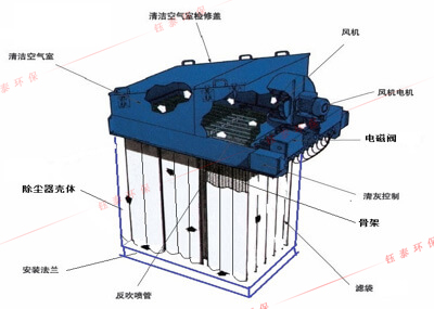 含塵空氣由風(fēng)口進(jìn)入除塵器箱體內(nèi),細(xì)小塵粒由于濾袋的多種效應(yīng)作用,被滯阻在濾袋外壁。凈化后的氣體通過(guò)濾袋從上箱體出風(fēng)口排出。隨著使用時(shí)間的增長(zhǎng),濾袋表面吸附的粉塵增多,濾袋的透氣性減弱,使除塵器阻力不斷增大。為保證除塵器的阻力控制在限定的范圍之內(nèi),由脈沖控制儀發(fā)出信號(hào),循序打開(kāi)電磁脈沖閥,使氣包內(nèi)的壓縮空氣由噴吹管各噴射到對(duì)應(yīng)的骨架(稱為一次風(fēng)),并在高速氣流通過(guò)骨架時(shí)誘導(dǎo)數(shù)倍于一次風(fēng)的周圍空氣(稱為二次風(fēng))進(jìn)入濾袋,造成濾袋瞬間急劇膨脹,由于反向脈沖氣流的沖擊作用很快消失,濾袋又急劇收縮,這樣使積附在濾袋外壁上的粉塵被清除。由于清灰是依次分別向幾組濾袋進(jìn)行,并不切斷需要處理的含塵空氣,所以在清灰過(guò)程中,除塵器的處理能力保持不變。