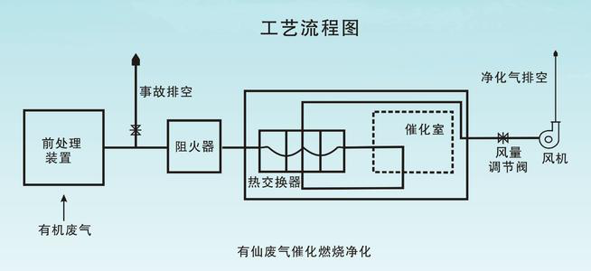 本裝置是利用催化劑做中間體,使有機(jī)氣體在較低的溫度下燃燒、生成無(wú)害的二氧化碳和水蒸氣排放。反應(yīng)方程式:
