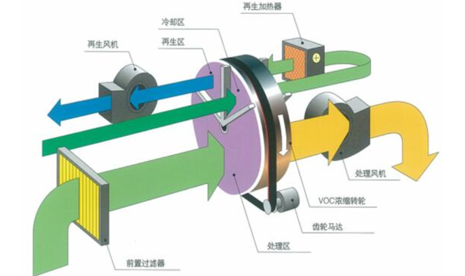沸石轉(zhuǎn)輪吸附濃縮裝置是轉(zhuǎn)輪在處理區(qū)-再生區(qū)-冷卻區(qū)三區(qū)連續(xù)變溫運(yùn)轉(zhuǎn),把低濃度、大風(fēng)量的有機(jī)廢氣濃縮為高濃度、小風(fēng)量的有機(jī)廢氣。其裝置特性適合處理大流量、低濃度、含多種有機(jī)成分的