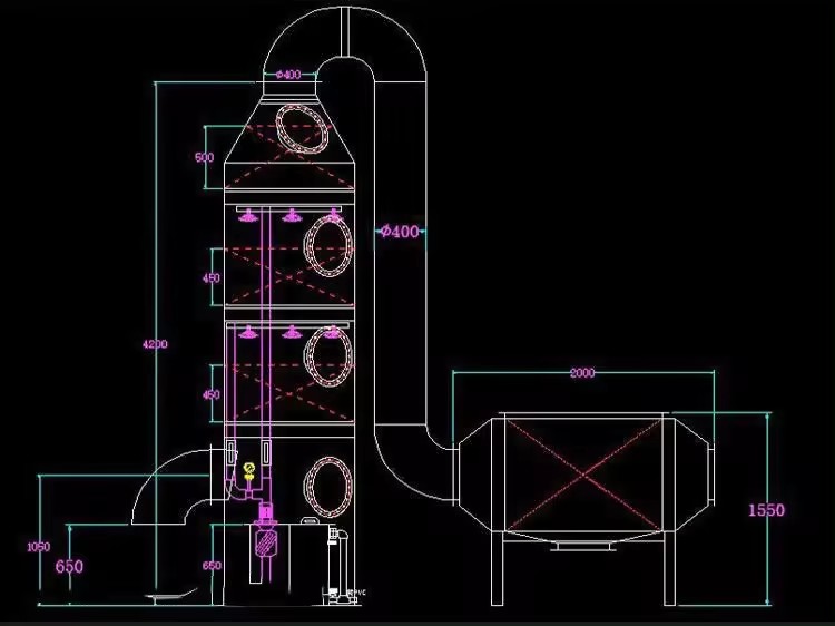 廢氣由風(fēng)機(jī)引入噴淋塔,內(nèi)筒形成壓力室,壓力室均勻分布到每個鼓泡管。廢氣通過鼓泡管,進(jìn)入液體吸收罐吸收鼓泡液體,然后氣泡通過填料層。氣-液兩相與吸收中和反應(yīng)完全接觸。水經(jīng)塔底的水泵加壓后噴在塔頂,最后返回塔底回收,并且吸收和過濾后的廢氣繼續(xù)向上流動并被噴射。管子噴出的吸收中和液產(chǎn)生最終反應(yīng)。中和反應(yīng)后,末端除霧板脫水除塵后的氣體排入大氣,它也可以與光氧催化或低溫等離子體和活性炭氣體凈化設(shè)備結(jié)合使用。處理后廢氣達(dá)到地方或國家排放標(biāo)準(zhǔn)和排放要求
