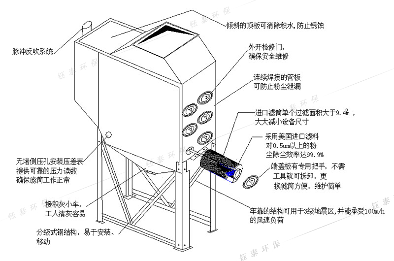 2.1、設(shè)備外型結(jié)構(gòu)特點:整體結(jié)構(gòu)嚴(yán)密,連續(xù)焊接的管板可防止粉塵的泄露。設(shè)備機(jī)體采用酸洗除銹,底漆、面漆采用環(huán)氧漆噴涂,環(huán)氧漆附著力強(qiáng),涂膜柔韌耐磨,耐化學(xué)腐蝕性能優(yōu)良,有極好的耐水、耐油、耐酸堿、耐溶劑性。