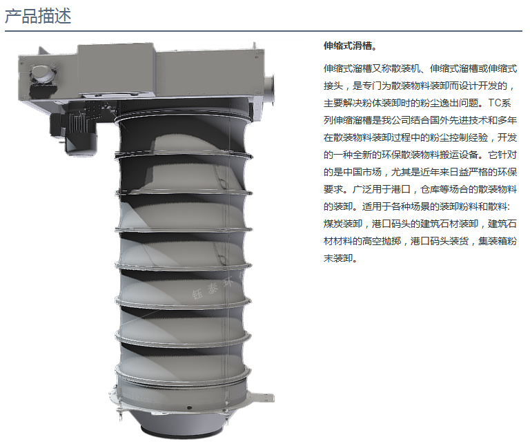 散裝物料伸縮溜筒主要特點:1.伸縮溜筒配套除塵器系統(tǒng),通過抽氣來收集裝料時產生的灰塵。2.自動控制卸料口接近卡車和火車車皮,從而節(jié)省時間,卸料口根據物料會迅速調整。3.外套筒用于控